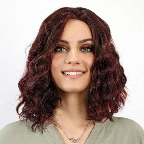 See õlgadeni ulatuv sügavpunane parukas koos esiletõstetud ja lainelise lokkis soenguga annab teile täiusliku välimuse, mis on nii vaevatu kui ka šikk.
